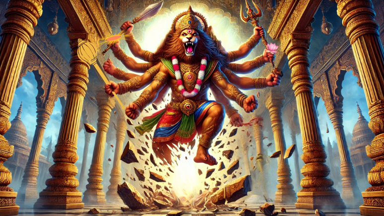 Hiranyakashipu struck the pillar with all his might, and out came Narasimha—the half-man, half-lion incarnation of Vishnu.