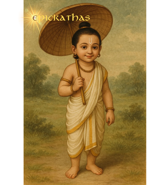 Once Mahabali performed a yagya (sacrificial fire), at the end of which he offered gifts or charity to all those who attended the yagya. Towards the end, a small boy entered the yagya hall. He carried just a wooden umbrella and a gentle smile.